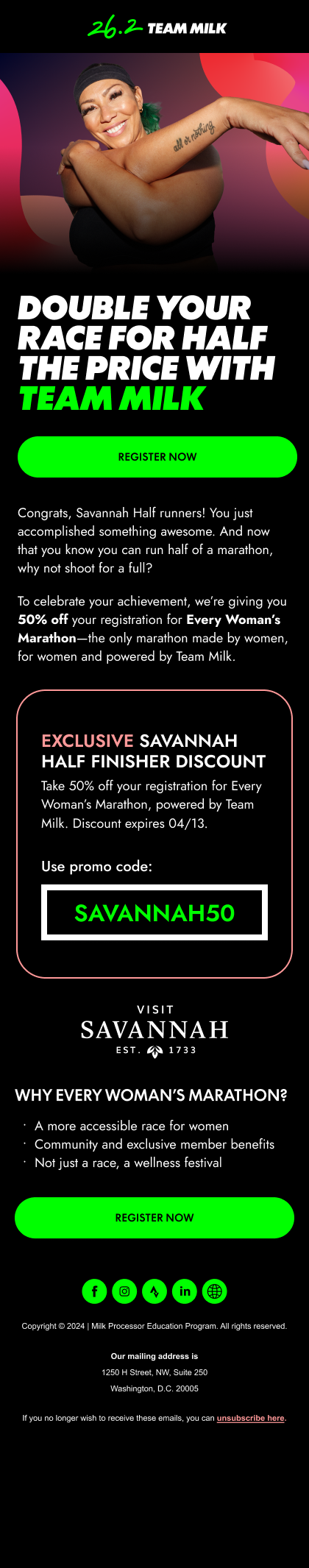 As an extension of MilkPEP’s 26.2 Team Milk program and their ongoing commitment to female athletes, we created an entire new marathon designed for women, by women. Every Woman’s Marathon is more accessible, more supportive, and more inclusive of EVERY woman — no matter their age, body type, or level of experience. Coming to Savannah in November 2024.